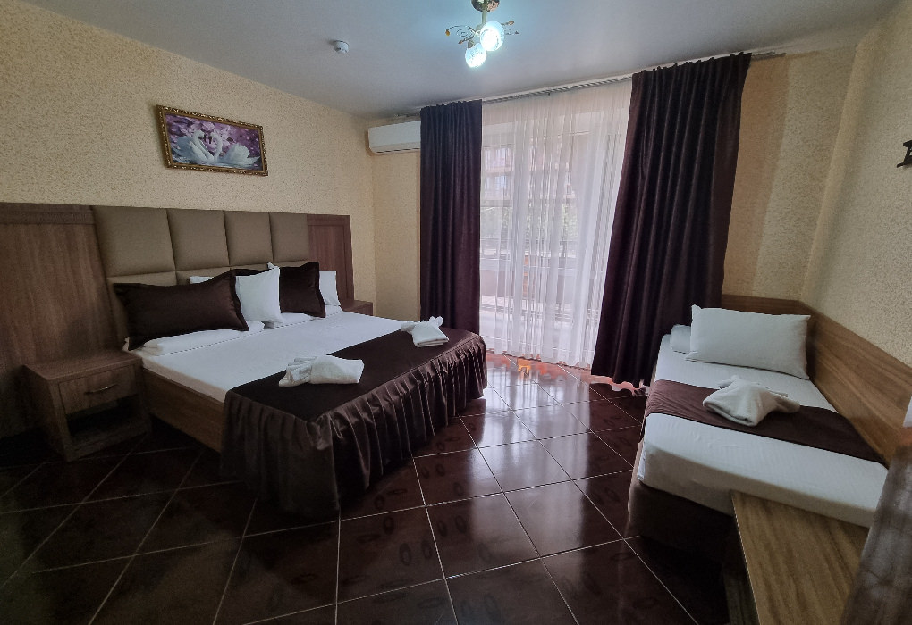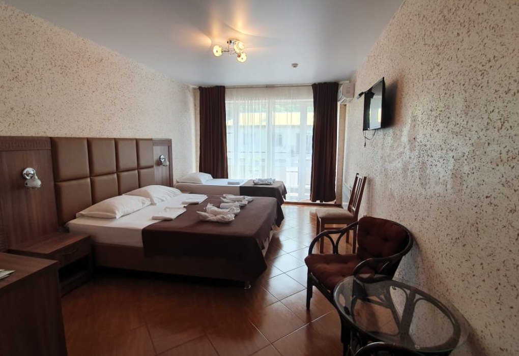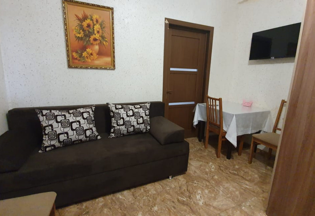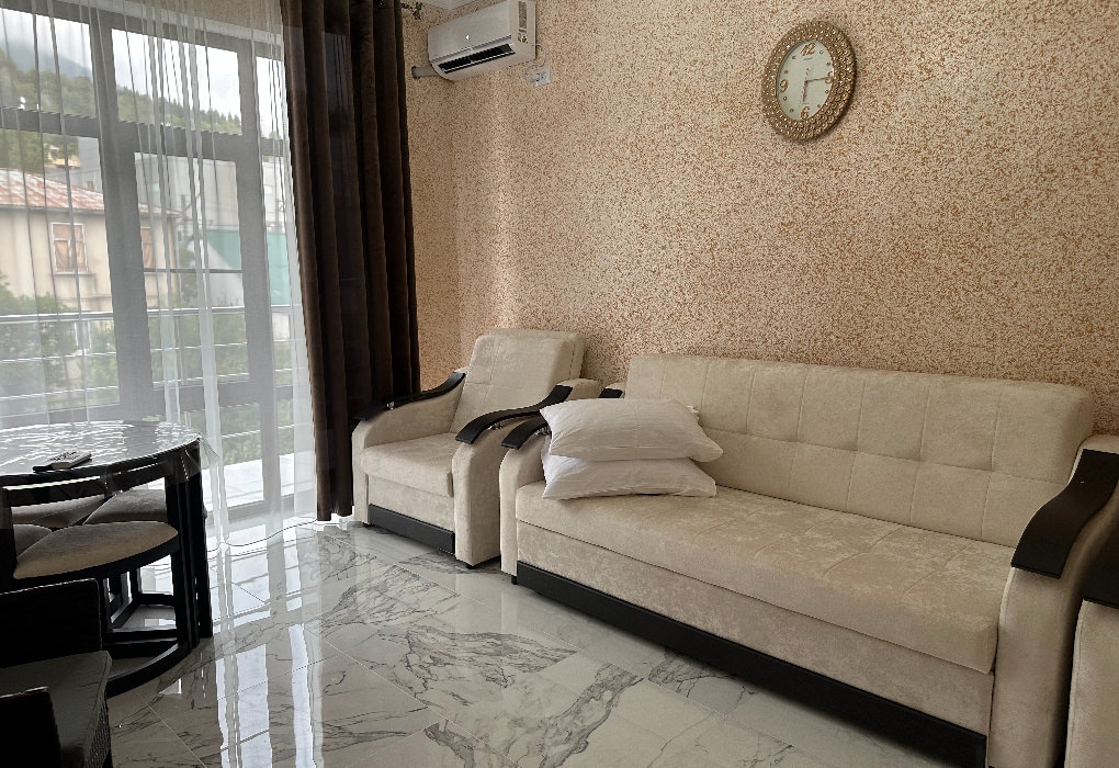2 комнаты. 4 осн. места. 2 изолированные комнаты и кухня, в спальне 2-спальная кровать, ТВ, шкаф, кондиционер, индивидуальный балкон; во второй комнате диван раскладной, кресло-кровать, ТВ, кондиционер, стол обеденный со стульями, индивидуальный балкон с мебелью. В номере: холодильник; душ; туалет; фен; набор посуды; микроволновая печь; чайник; мультиварка; кухня. 1 доп. место: