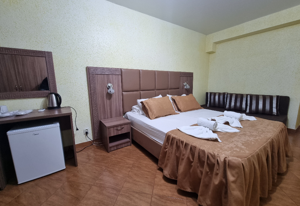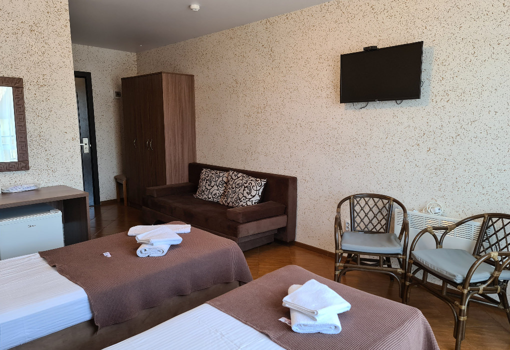 1 комната. 3 осн. места. 2-спальная кровать и 1-спальная кровать или 2-спальная кровать и диван раскладной. В номере: телевизор; балкон; кондиционер; душ; туалет; фен; мебель на балконе; мини-холодильник; чайник.