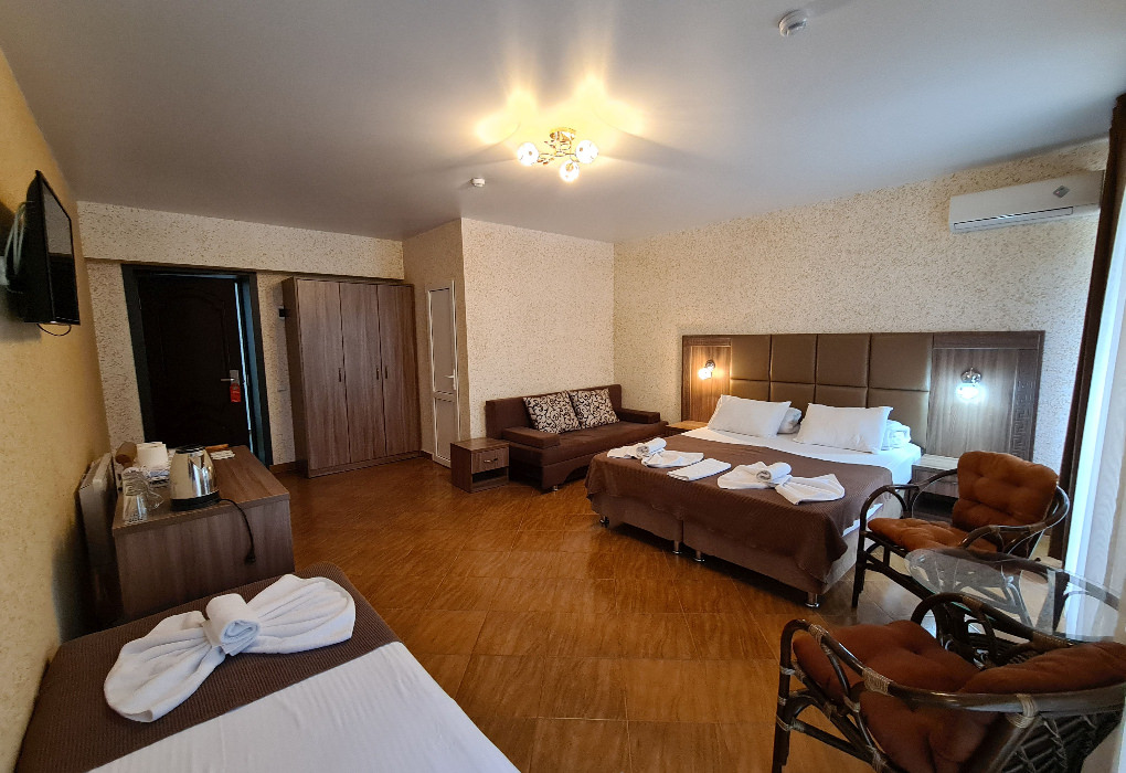 1 комната. 4 осн. места. 2-спальная кровать и две 1-спальные кровати или 2-спальная кровать, 1-спальная кровать и диван раскладной. В номере: телевизор; балкон; кондиционер; душ; туалет; фен; мебель на балконе; мини-холодильник; чайник. 1 доп. место: